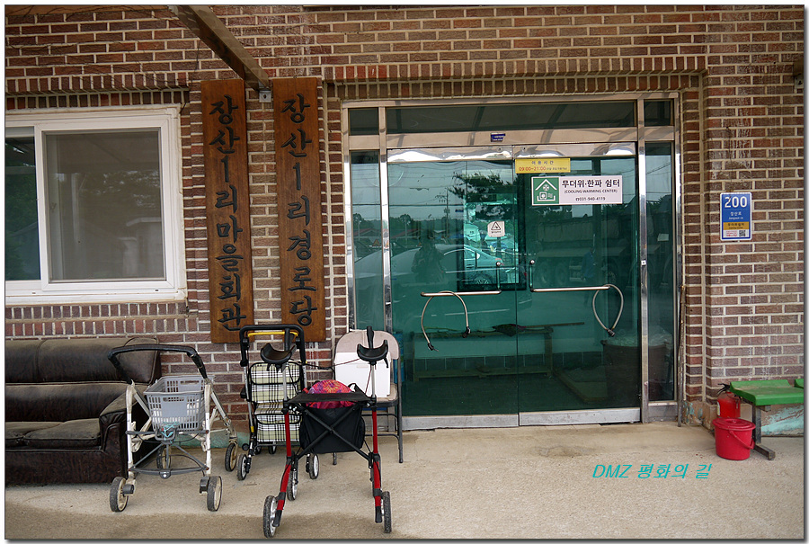 어르신들의 필수품인 보행기 몇 대가 경로당 앞에 주차(?) 되어 있다.