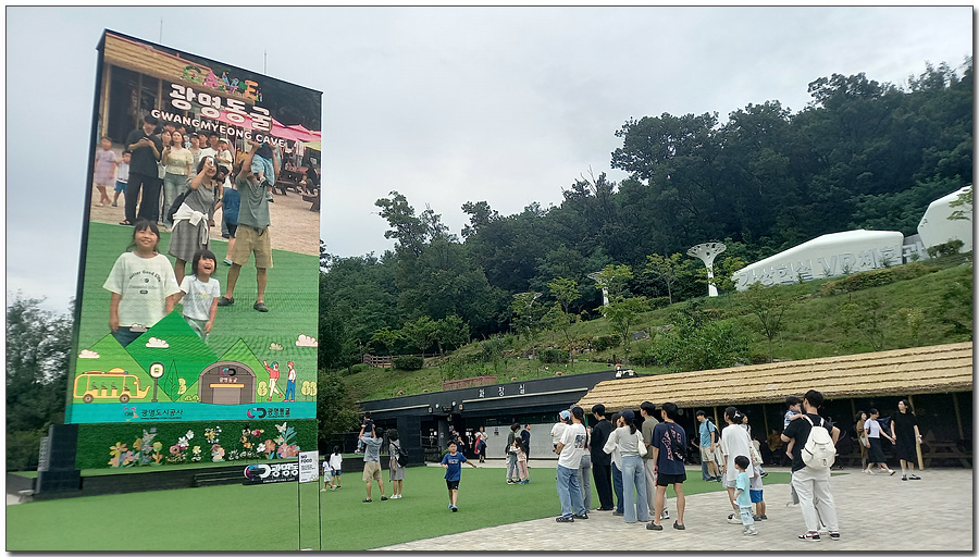 광명동굴 빛의 광장에 있는 대형 전광판 앞에 긴줄이 있다. 앞쪽에 설치된 카메라 앞에 서면 대형 전광판에 가족 영상이 보인다. 전광판에 영상이 뜨면 그걸 촬영하느라 너무 재밌게 즐기는 모습이 보기도 좋다. 그런 모습을 보면서 덩달아 내 마음도 행복해진다.