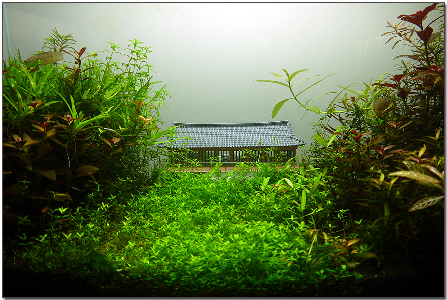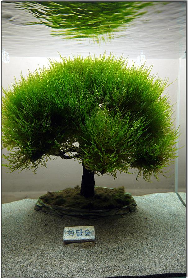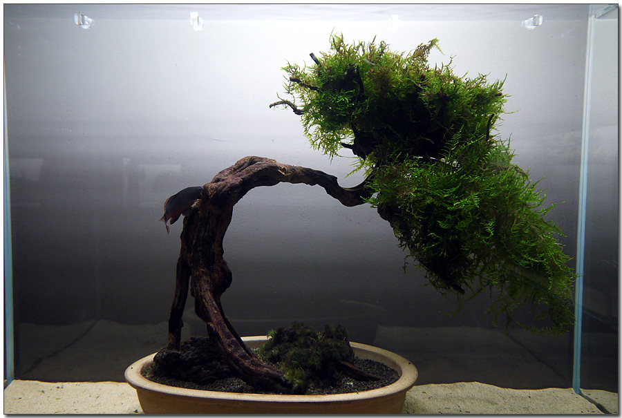 실제 분재 화분에 유목을 성형하여 부착하고 수생 이끼를 활착해 수중 문인목을 만들었다.