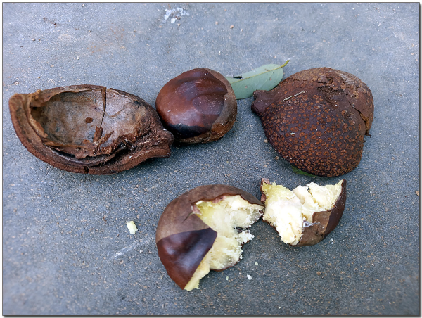 나무 아래 마치 밤을 닮은 열매들이 수북하다.