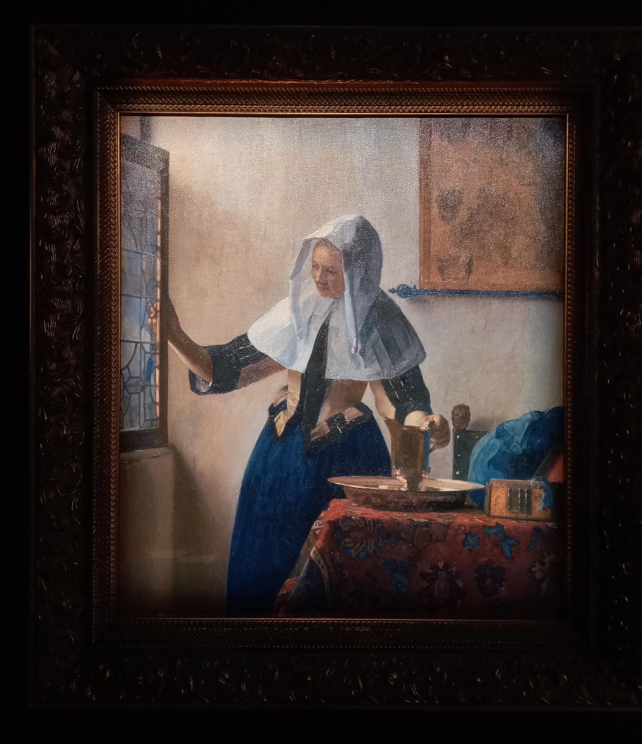 고요한 화면과 대조적으로 우유가 주전자에서 떨어지는 모습에 집중하게 된다. 테이블 위의 빵과 우유를 따르는 여인의 앞치마나 테이블보의 푸른색이 정말 신비롭고 아름답다.