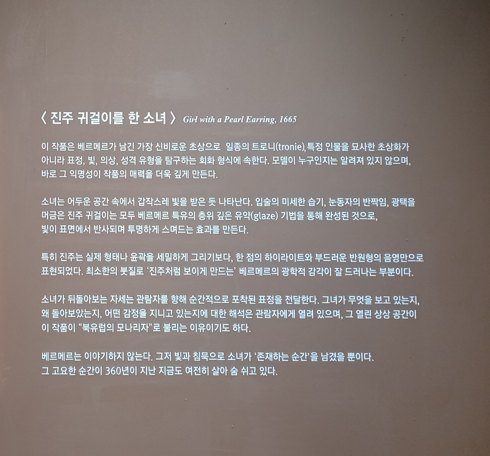 오래전에 '진주귀걸이' 동명의 제목으로 된 트레이시 슈발리에가 지은 장편소설을 읽은 적이 있는데, 그때 이 그림에 '북구의 모나리자'라는 애칭이 붙어 있다는 걸 알게 되었다. 이 작품의 모델이 누군지 알려지지 않았으므로 바로 그 익명성 때문에 이 초상화에 대한 여러 설이 있는 것 같다.