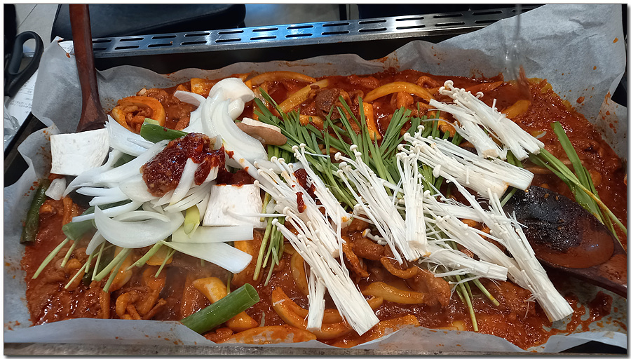 우리는 양념 오리 주물럭 한 마리 반과 야채사리를 추가로 주문하였다.